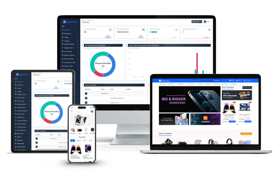Manage your e-commerce business with ease using GetCommerce's platform. With a unified admin web panel, intuitive user app, and dedicated admin mobile app, running your store has never been smoother.